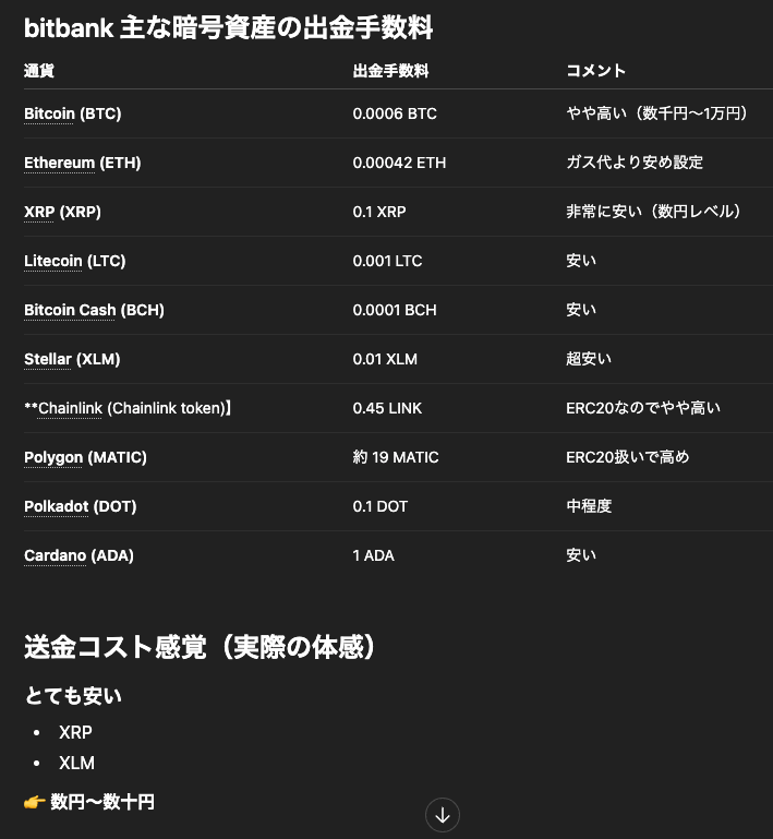 bitbankで送金手数料が安い通貨(実質コスト)